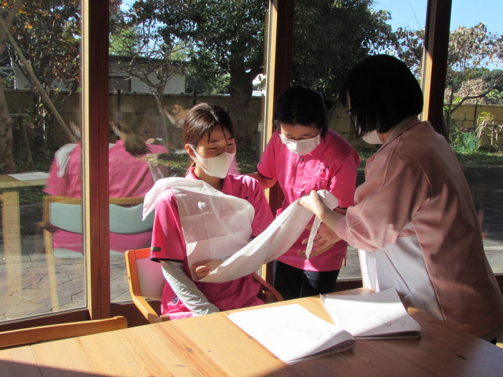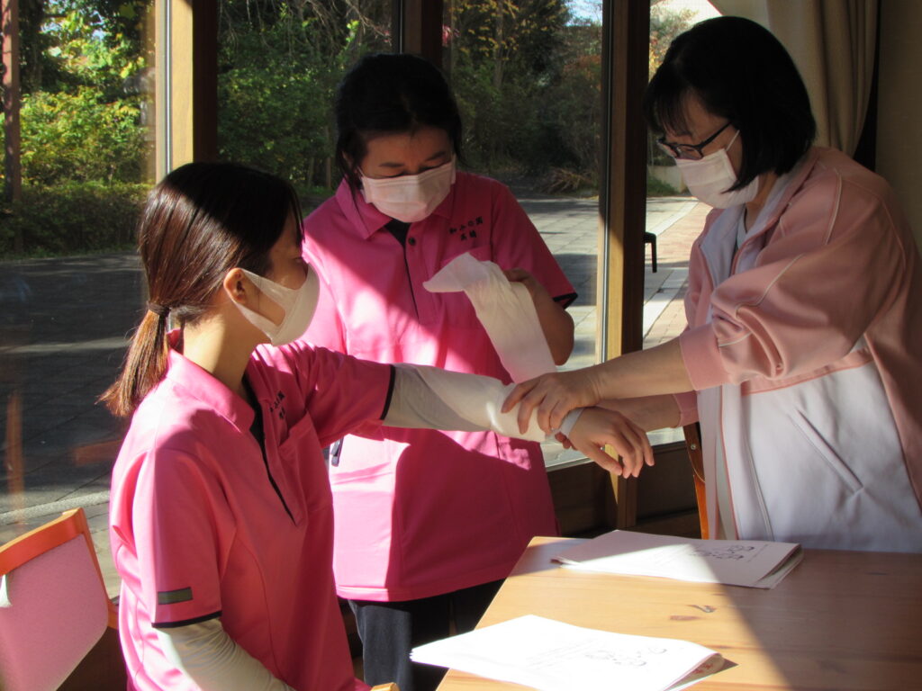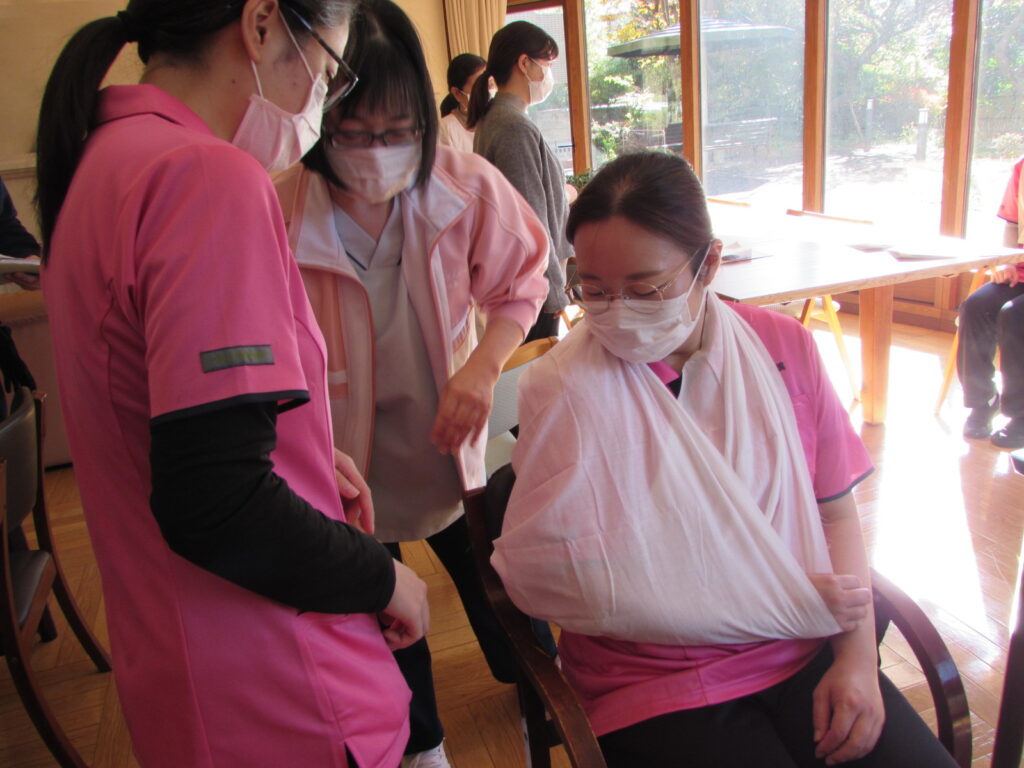三角巾の使い方をたくさん教わりました。